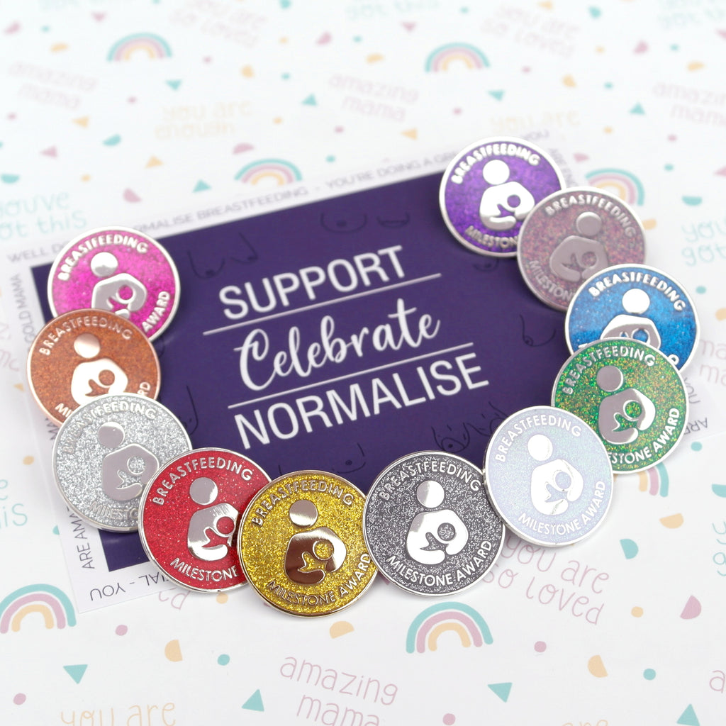 The beautiful glitter background colours represent the different milestones - each one amazing and totally worthy of celebration. To read about my own breastfeeding journeys and find out more about why I decided to create these pins, read my blog post.