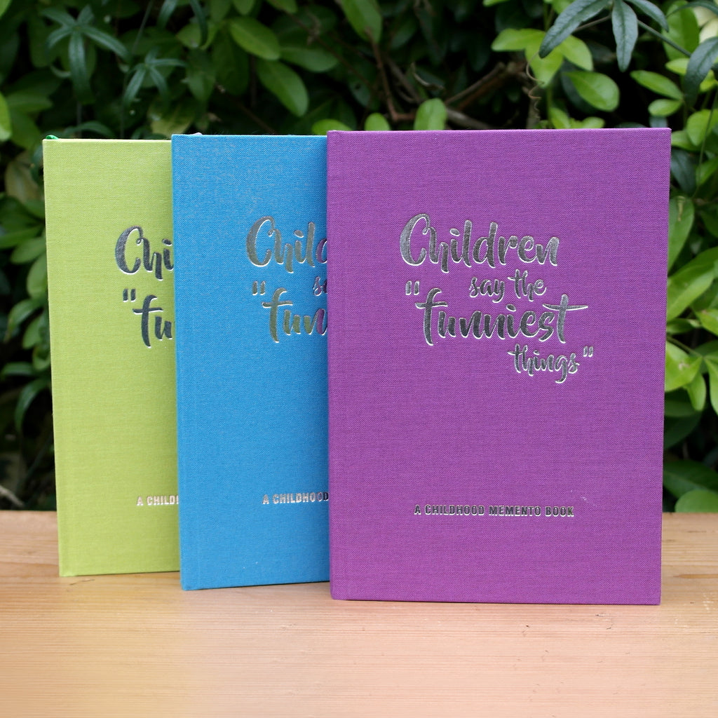Now you can record those brilliant childhood anecdotes and treasure the memories with these 'Children say the funniest things' keepsake memento books. Hand crafted in England and filled with 160 pages of FSC certified paper, these A5 sized hardback linen books are available in teal, lime or purple and have matching endpapers, a coordinating ribbon and beautiful foiled covers. There is a space on the first page to record your child or children's name/s, and the inner pages are divided up with space for details to go with each quote or story.