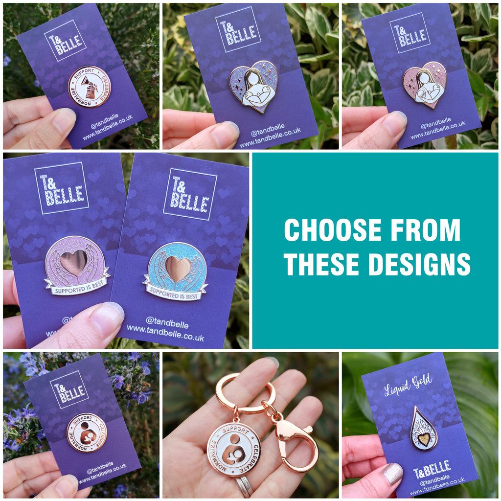 - 1 Breastfeeding enamel pin or keyring of your choice.