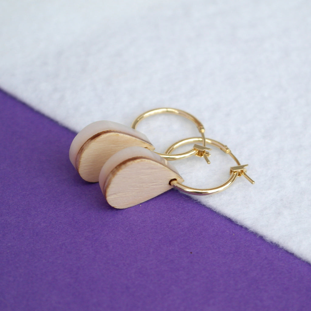 Each acrylic piece is laser cut then delicately hand assembled and glued onto the plywood backing. The droplets are smoothed and polished before being placed on gorgeous thick silver plated hoops.