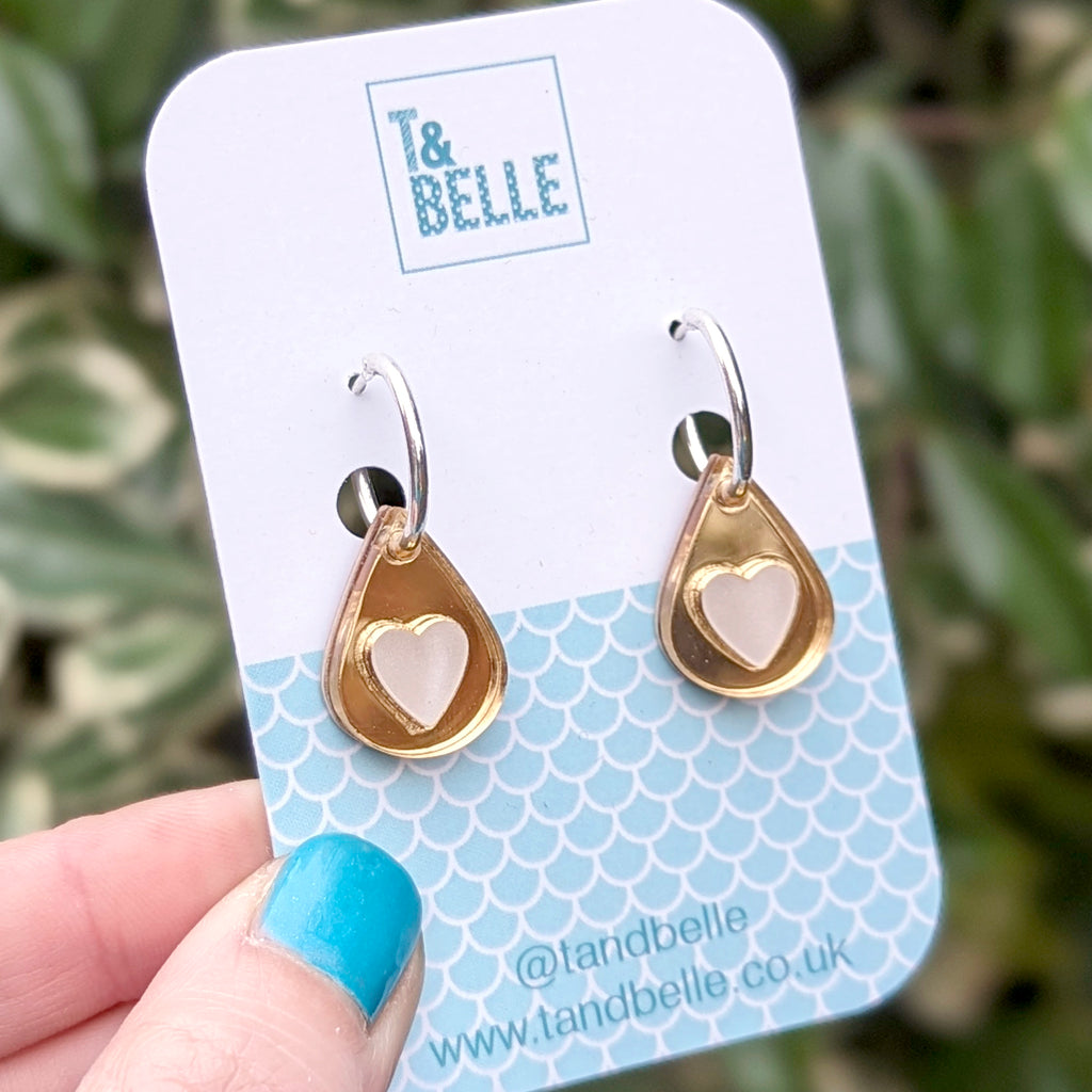 These liquid love earrings feature gold mirror finish acrylic with a pearl white heart at their centre. I created this combination of droplet and heart to celebrate the love and nurture of breastfeeding.