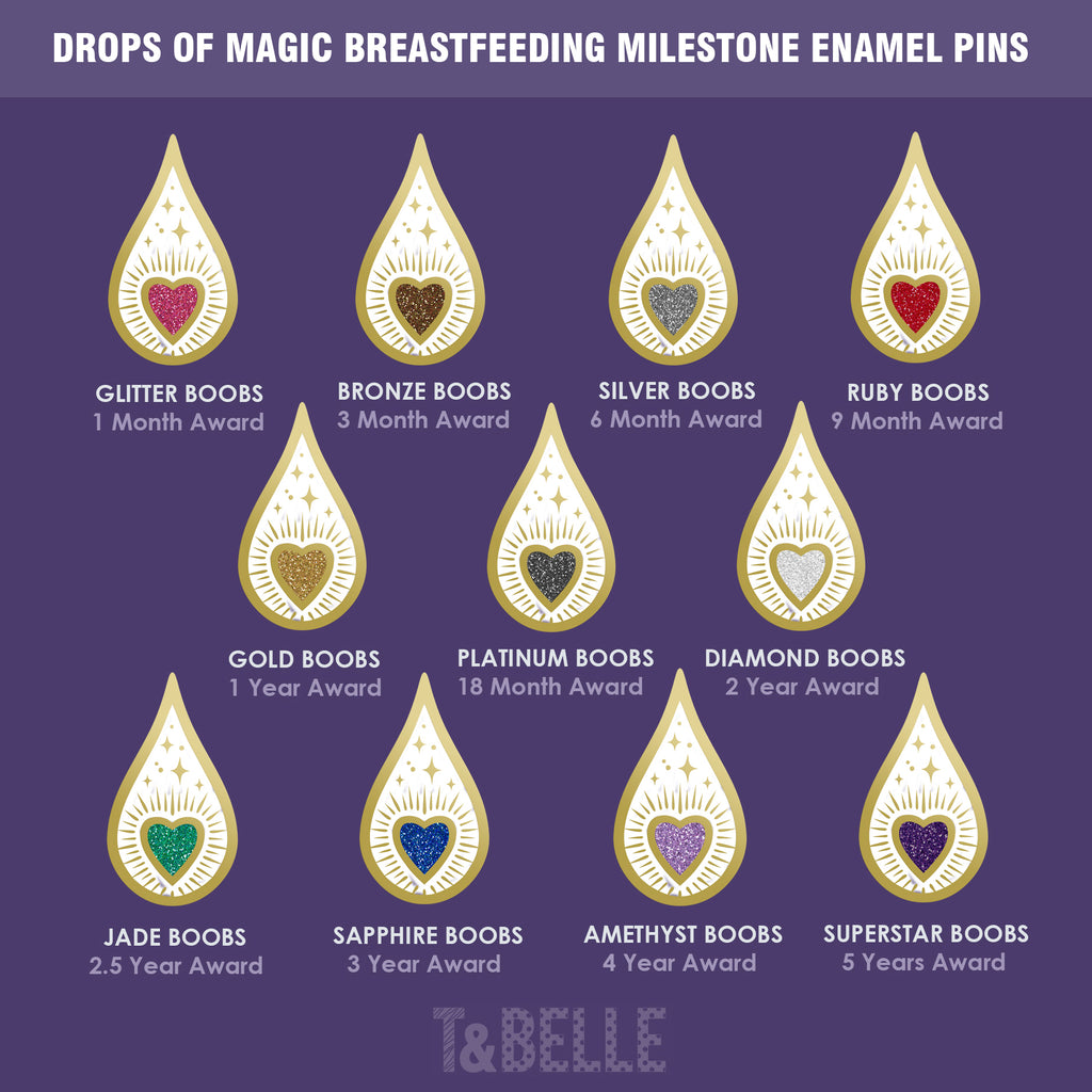I created my range of pins so that nursing parents everywhere can celebrate their amazing feeding milestones, from the first month of liquid gold and tiny baby snuggles, through the toddler years and beyond. You are all absolute heroes and deserve a medal... or a pin! The beautiful glitter background colours represent the different milestones - each one amazing and totally worthy of celebration.
