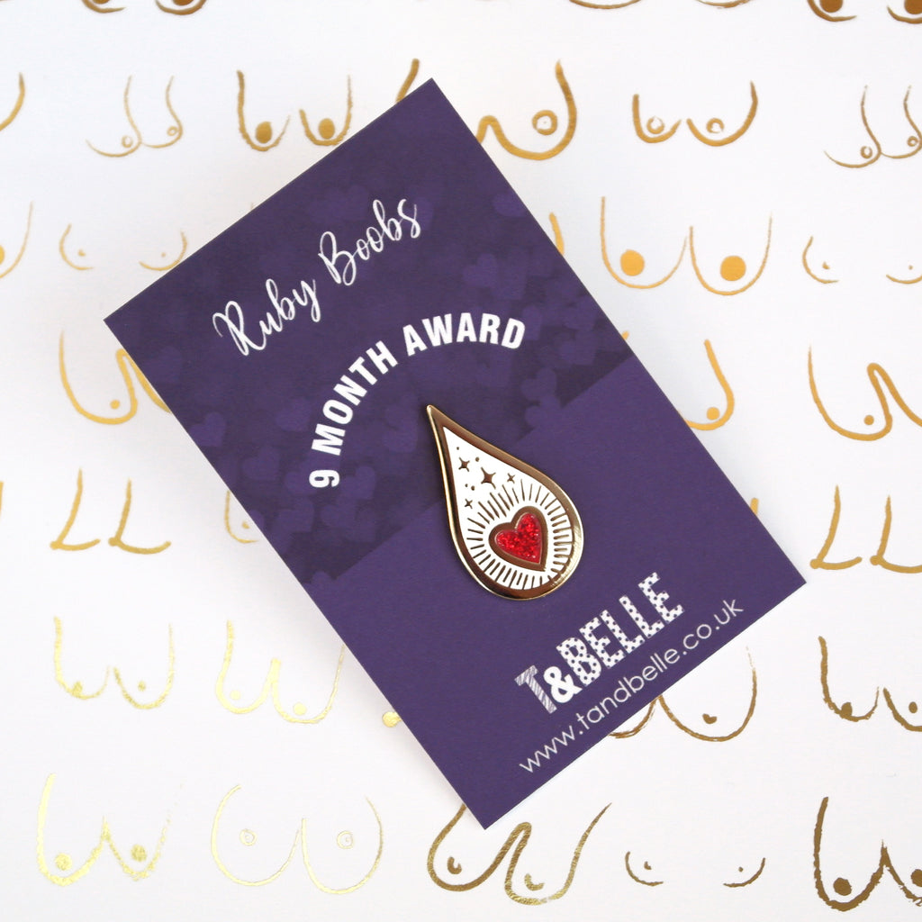 Drops of Magic Ruby milestone award keepsake pin badge - celebrating 9 months of breastfeeding, chestfeeding or pumping. For many parents, breastfeeding doesn't look quite as they'd imagined, maybe they are exclusively expressing, feeding using a SNS or a feeding tube. My new milestone design was created to be inclusive and celebrate the magic in every drop of human milk. Each pin is: