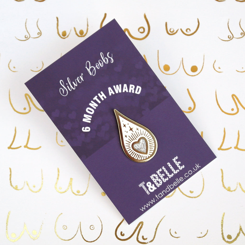 Drops of Magic Silver milestone award keepsake pin badge - celebrating 6 months of breastfeeding, chestfeeding or pumping. For many parents, breastfeeding doesn't look quite as they'd imagined, maybe they are exclusively expressing, feeding using a SNS or a feeding tube. My new milestone design was created to be inclusive and celebrate the magic in every drop of human milk. Each pin is: