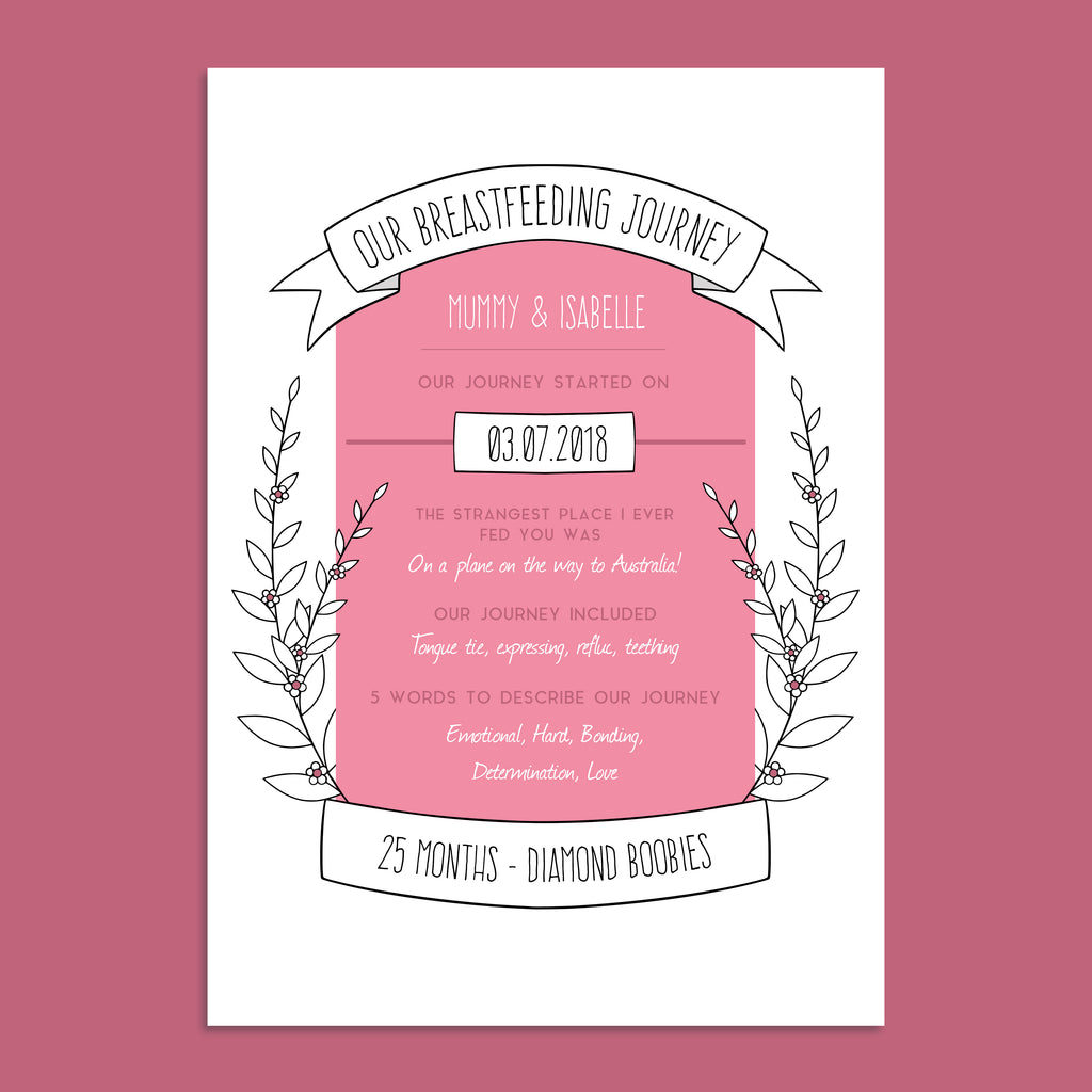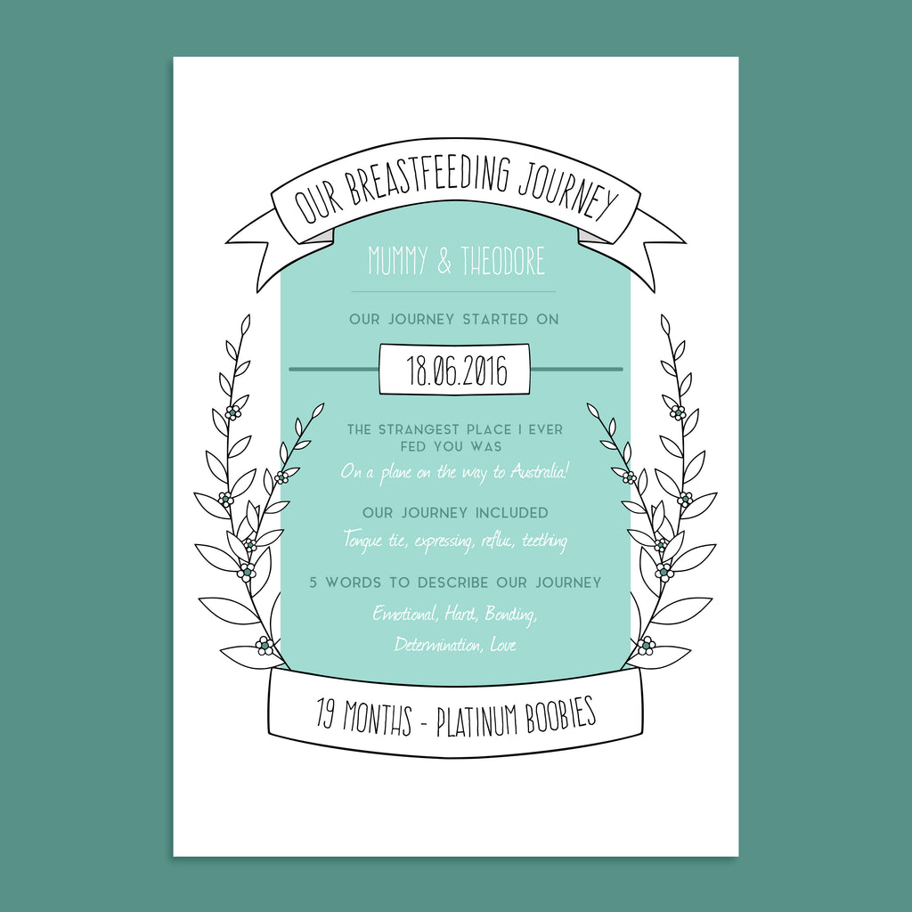 Now you can celebrate your breastfeeding journey in a way that is totally personal to you. Printed on high quality archival paper, these beautiful A4 sized customised prints are ready to be displayed in the frame of your choice and also come in a leaves style. They are currently available in 2 colours (custom colours are also available).