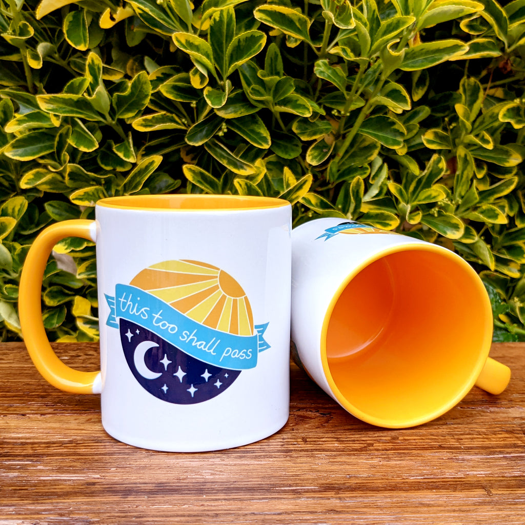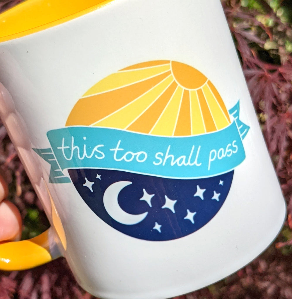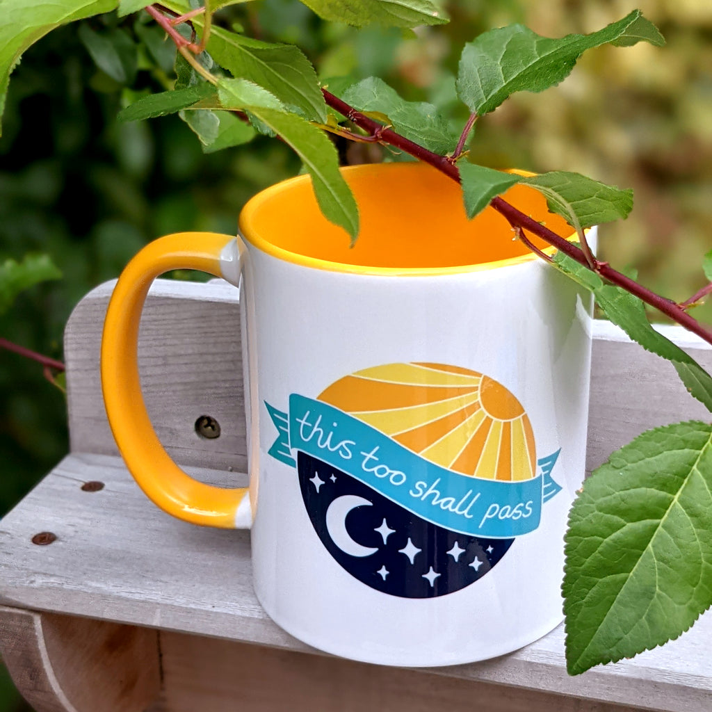 Teething... that delightful cold the kids brought home from nursery or school... the 4 month sleep regression... parenting in lockdown... My 'this too shall pass' positive affirmation sun and moon mug is a little reminder that just as night follows day and day follows night, this too shall pass. Take five minutes and pour yourself a cuppa - if you're lucky you might even get to drink it while it's hot!