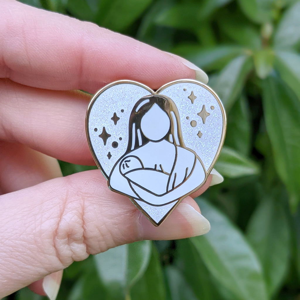 Celebrate your breastfeeding journey with this new keepsake pin badge design featuring a mum nursing her little one surrounded by a big glittering iridescent heart to show the love and bond of the dyad.