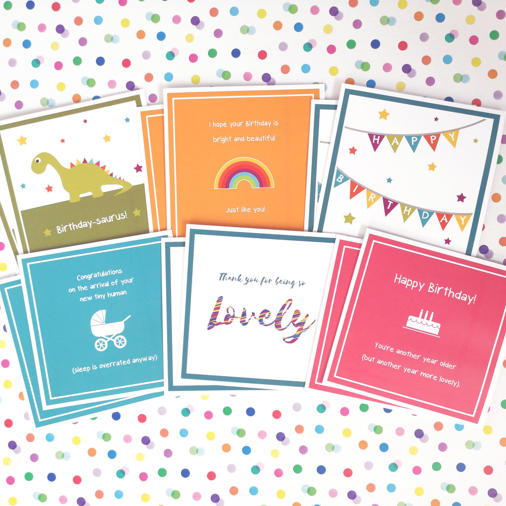Due to an error at the printers, I have several packs of SECONDS greetings cards available in my bestselling designs for a special price. These cards have a shiny finish on the outside instead of my usual matte style but are still bright, fun, recycled and packaged plastic free. Buy a pack of 6 (1 of each design) for £5.