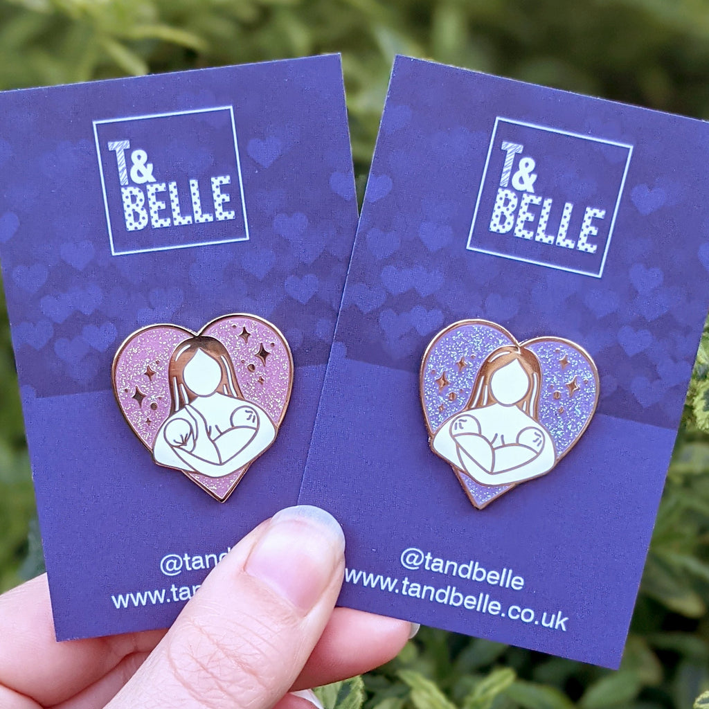 Celebrate your tandem feeding journey with this new keepsake pin badge. My tandem feeding design features a mum cradling a baby and older child surrounded by a big glittering heart to show this shared love.
