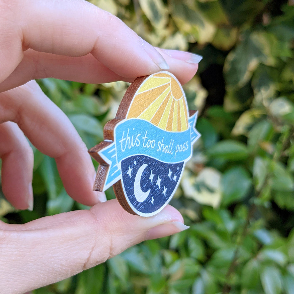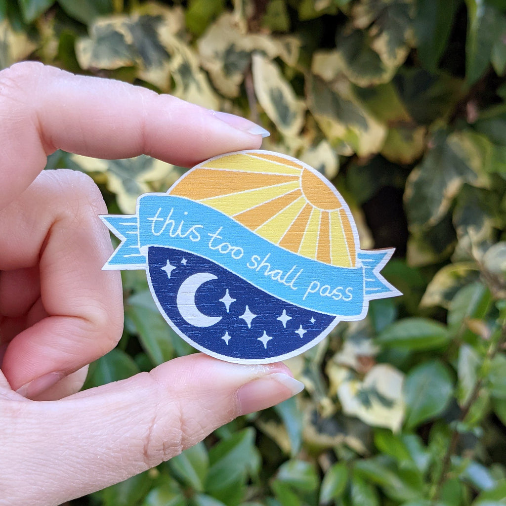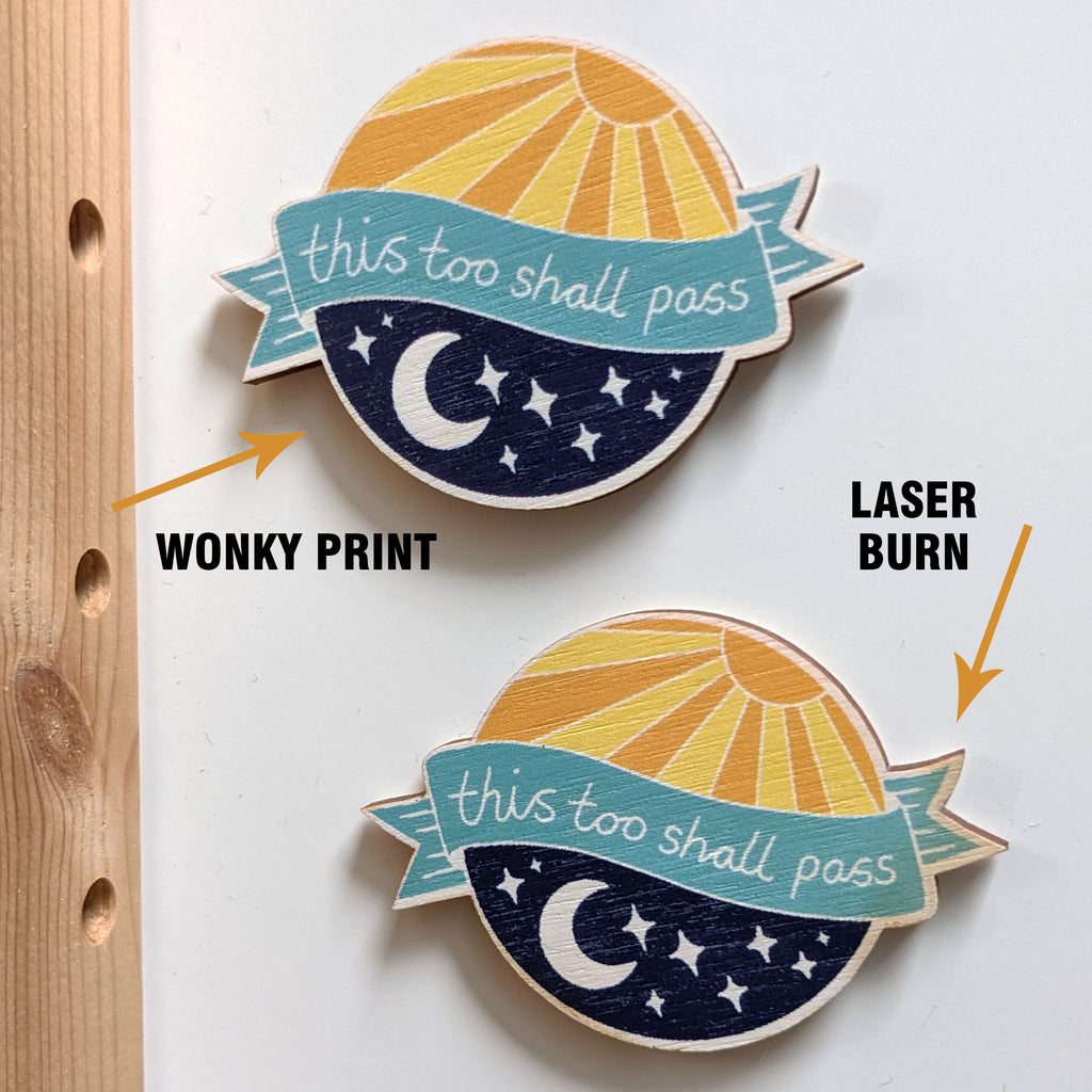 These little wooden magnets are not quite perfect, but they are still a wonderful reminder for your fridge that 'this too shall pass'. They could have slightly wonky prints or a little laser burn from the cutting process (see second image for examples).