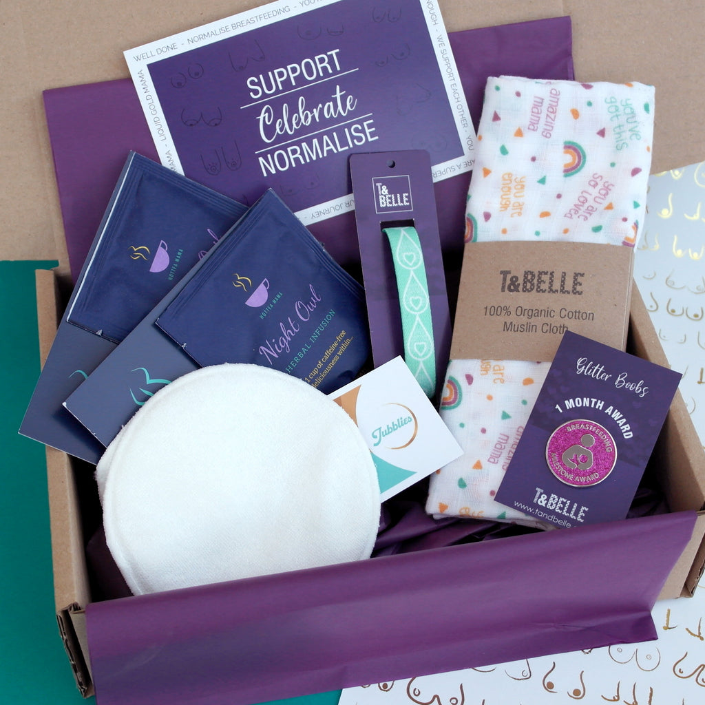 This box of gorgeous breastfeeding treats is the perfect gift for a breastfeeding mama to mark a special breastfeeding milestone or as wonderful treat for yourself (because you totally deserve it)! It includes some of my bestselling original T & Belle designs plus curated items from two wonderful independent and ethical businesses.